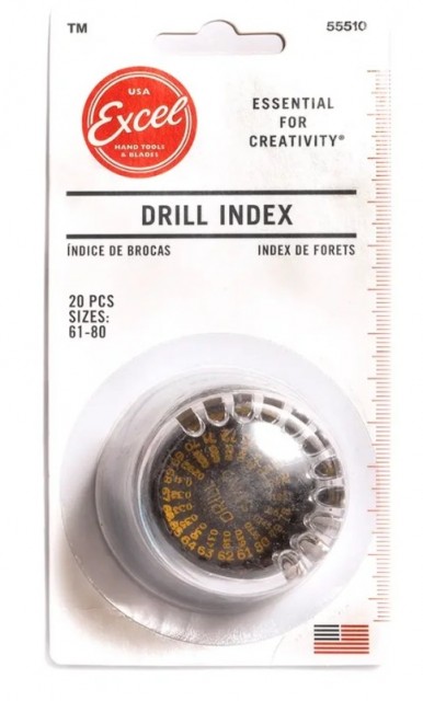 The Excel Blades 20-piece precision drill bit set is ideal for delicate work in model building, miniatures, jewelry, resin, and plastic materials. It includes drill bits from #61 to #80, made of high-speed steel (HSS), neatly stored in a practical dome-shaped organizer that keeps each bit protected and labeled.