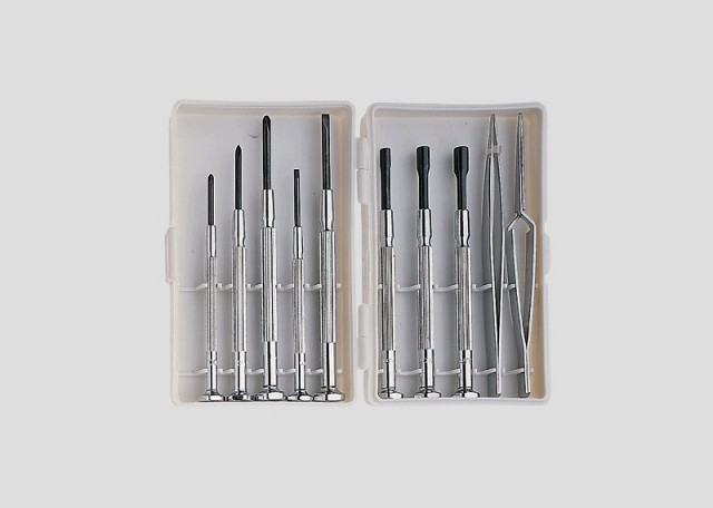 Suitable for maintenance work on H0 and Z models. Contents: 1 each PH 00, PH 0 and PH 1 Philips screwdrivers. 1 each 2.0 mm and 3.0 mm flat blade screwdrivers. 1 each 2.5 mm, 3.0 mm and 3.5 mm nut drivers. 1 regular tweezers and 1 compression tweezers.