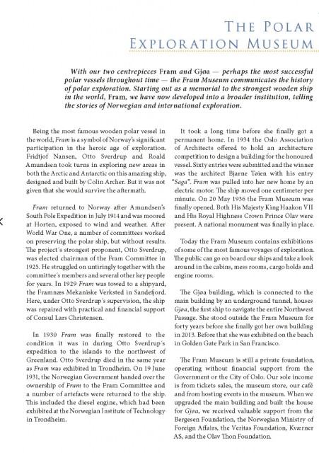 This book contains all the texts and illustrations from the permanent exhibitions in the Fram Museum. In addition there are a number of photos of Fram and Gjøa, of exhibited artifacts, and a map of the museum.